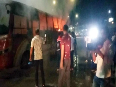 তাঁতীবাজার মোড়ে দিশারি পরিবহনের বাসে আগুন