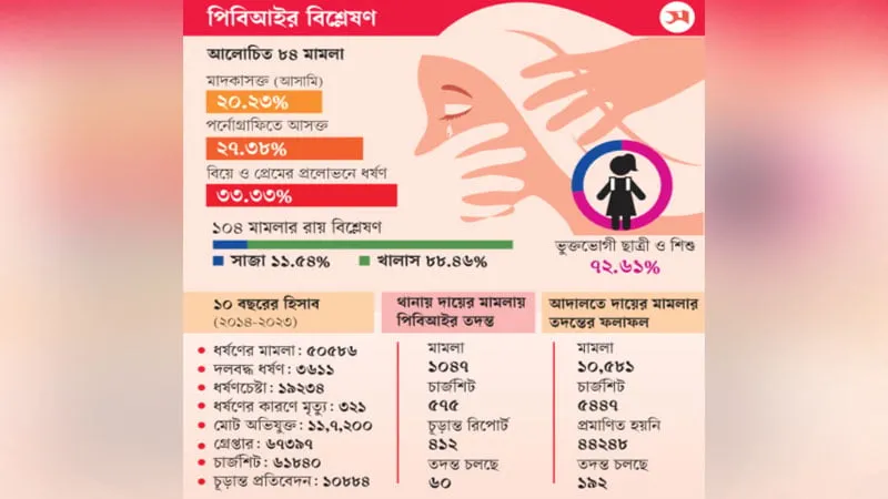 ২০১৬ থেকে ২০২৩ সাল পর্যন্ত দেশের বিভিন্ন থানা ও আদালতে দায়ের করা ১১ হাজার ৬২৮টি ধর্ষণ মামলা বিশ্লেষণ করেছে পিবিআই। এর মধ্যে ২৫২টি মামলার তদন্ত এখনো চলছে। গবেষণার অংশ হিসেবে তারা আলোচিত ৮৪টি মামলার ৮৭ জন অভিযুক্তকে জিজ্ঞাসাবাদ করে। তাদের কাছে ৩১টি প্রশ্ন রাখা হয়। সেখানে উঠে আসে, অনেক আসামির পূর্বে থেকেই মাদক ও পর্নোগ্রাফির প্রতি আসক্তি ছিল। কেউ প্রেম বা বিয়ের প্রলোভন দেখিয়ে অপরাধে জড়িয়েছে। ভুক্তভোগীদের মধ্যে উল্লেখযোগ্য অংশই শিশু ও ছাত্রী। অনেক ঘটনায় অপরাধী ছিল ভুক্তভোগীর আত্মীয় বা পরিচিতজন, আর ভুক্তভোগীরা ছিলেন অতিদরিদ্র পরিবার থেকে আসা।